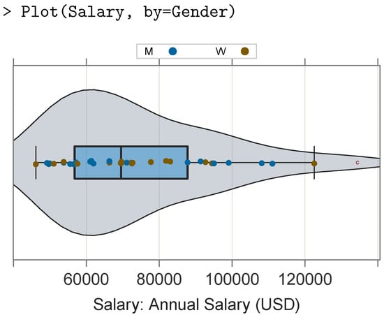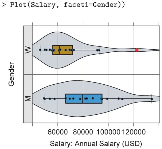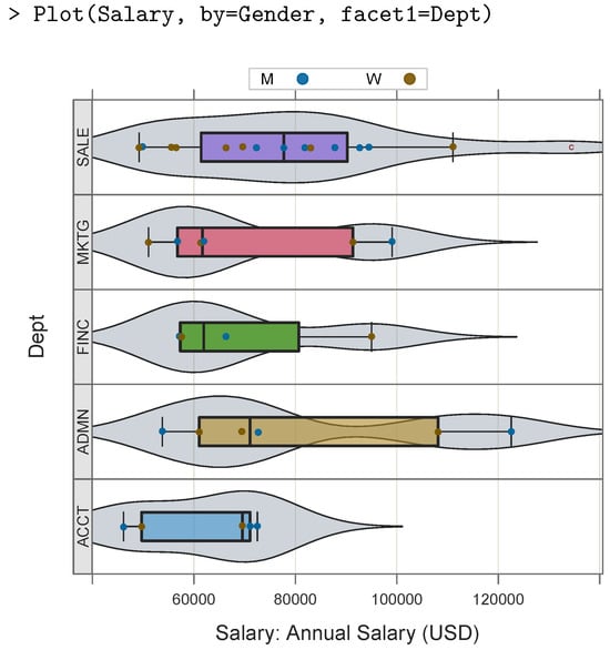 To compare the distribution of a continuous variable across the levels of a second categorical variable, Plot() provides for Cleveland’s ([15]) multi-panel trellis plots, with one plot for each level of the categorical variable, the components of which Wickham ([10]) referred to as facets. The parameters facet1 and possibly facet2 are invoked to specify comparisons across one or two categorical variables, respectively, namely the conditioned variables. Figure 6 displays the distributions of salaries within the company conditioned upon two levels of gender.