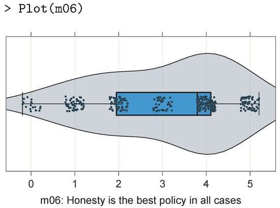To illustrate this, consider a VBS plot for the sixth item from the 20 item Mach IV scale [16]. Responses from 351 respondents were measured on a six-point Likert scale, assessed with values ranging from strongly disagree (0) to strongly agree (5). The data are available as part of lessR, in the data file referenced as Read("Mach4").