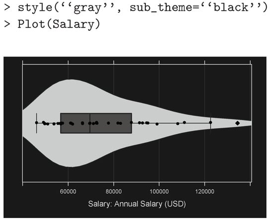 In addition to the default theme, the lessR package provides a variety of color themes and sub-themes specified with the lessR function style(). The first argument of style() is theme. The themes are pre-selected color combinations, such as the default “colors” theme or specific color names such as “darkred” or “dodgerblue”. As illustrated in Figure 11, a grayscale is specify with the “gray” theme. The black sub-theme provides a black background for the graphics window, with other characteristics of the visualization adjusted accordingly.