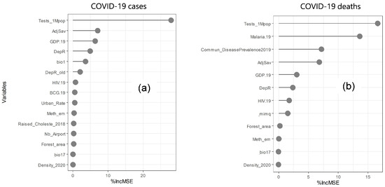 Figure 2 summarises the relative importance of the selected variables (fifteen for COVID-19 cases and twelve for COVID-19 deaths) based on the Random Forest. For the COVID-19 cases, among the variables, the five with the highest relative importance were found to be the number of tests per 1 million people (Tests_1Mpop, 28%) followed by adjusted savings (AdjSav, 7%), GDP per capita (GDP.19, 6.5%), dependence ratio (DepR, 5%), and annual mean temperature (bio1, 4%) (Figure 2a). The contribution of the other variables was roughly null. For the COVID-19 deaths, the number of tests per 1 million people (Tests_1Mpop, 17%) had the highest relative importance, followed by the prevalence of malaria (Malaria.19, 14%), the prevalence of communicable diseases (Commun_DiseasePrevalence2019, 7%), AdjSav (6.8%), and GDP (6.5%) (Figure 2b). The contributions of the dependence ratio, prevalence of HIV (HIV.19), and moisture index of the most moist quarter (mimq) were very low and those of Forest_area, methane emissions (Meth_em), precipitation of driest quarter (bio17), and population density (Density_2020) were roughly null.