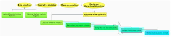 Figure 2 shows the main steps for carrying out the current research, starting from the choice of indicators for NUTS-3 regions, identified by querying the databases made available by the National Statistics Institutes of the two states. An attempt was made to cover as many sectors of interest as possible for the economies of the two countries, such as education, health, transport, etc. The next step consisted of the general presentation of the data discovered through the descriptive statistics initially carried out for all the analyzed regions and later for each individual state. In order to deepen the analysis of the regional indicators, maps were created to illustrate the situation in which each region was found for the year 2022 (this being the last year for which data on the indicators were made available). Since there were different units of measure and orders of magnitude of the indicators, before proceeding to the next step shown in Figure 2, it was necessary to standardize the data. In order to help identify some similarities between regions, a cluster analysis was carried out based on the agglomerative method of hierarchical algorithms, which starts by calculating the Euclidean distances, and in this step each region constitutes a cluster. The algorithm continues with the merging of the two closest clusters (depending on the chosen linkage method, in the present case using complete and Ward), the distances being recalculated after each union, and these steps being carried out until a single class is formed.