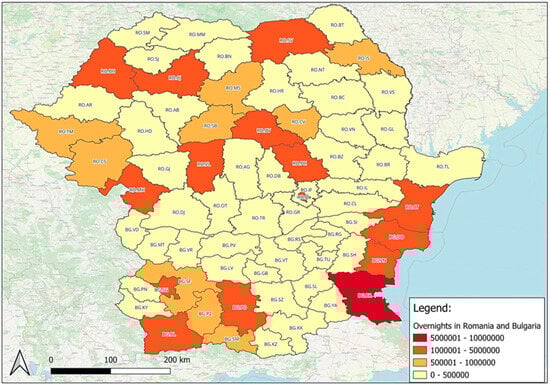 According to the map in Figure 3, the regions in Romania where the most accommodation nights were spent are Constanța and Bucharest, followed by Brașov, Vâlcea, Bihor, Cluj, Prahova, and Suceava (see Appendix A Table A1). This fact is to be expected considering that these regions are known to attract the most tourists because Constanța is located near the Black Sea, while Brașov and Prahova are known for their mountain resorts. In the case of Bulgaria, the most overnights spent in accommodation establishments were registered in Burgas, leading the ranking of the regions in both countries. Other regions with significant values are Varna, Plovdiv, Blagoevgrad, the capital, and Dobrich, and in this case, the values can be explained by the tourists’ interest in the seaside resorts, or visiting the capital. Also, Plovdiv is among the most developed cities, except Sofia.
