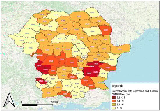 For the unemployment rate, the lowest values were found in the regions of Bucharest and Ilfov, followed by regions in the west of the country and Constanța, while increased values were observed in Vaslui, Teleorman, and Dolj. Low values were found in the most developed cities, as well as in those with significant tourist potential. While the regions of Bulgaria, Varna, Stara Zagora, Hskovo, Kardzhali, and Sofia register the lowest rates, at the opposite pole are Shumen, Pernik, and Silistra (Figure 4).
