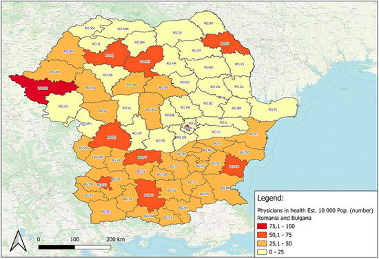 The highest numbers of physicians per 10,000 inhabitants were awarded to Bucharest and Timiș, followed by Iași and Cluj (Figure 5). It can be noticed that in many Romanian regions, there were very low values for this indicator, the acute lack of doctors [30], especially those in rural areas, being best observed in this context. As for Bulgaria, the maximum value reached only 72.40 physicians in health establishments per 10,000 inhabitants in Pleven, followed by Plovdiv, Varna, and the capital. Although even in this case the recorded values are small, the region with the lowest value exceeds more than half of Romania’s regions.