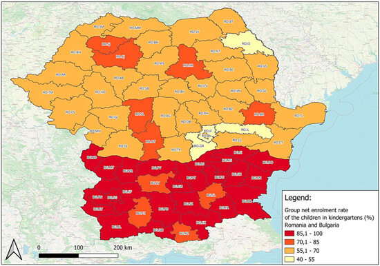 Figure 7 shows the situation of the kindergarten enrollment rate, noting the much higher percentages of the regions in Bulgaria compared to those in Romania; this can be explained by the Bulgarian policy to cover the costs of nurseries and kindergartens, without the burden falling any further on the parents [31].