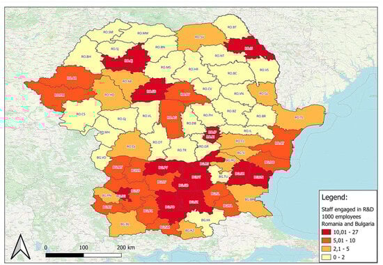 Regarding the personnel employed in the field of research and development, according to Figure 8, it can be seen that the highest percentages were found in regions in the territory of Bulgaria, while most regions in Romania had low values.