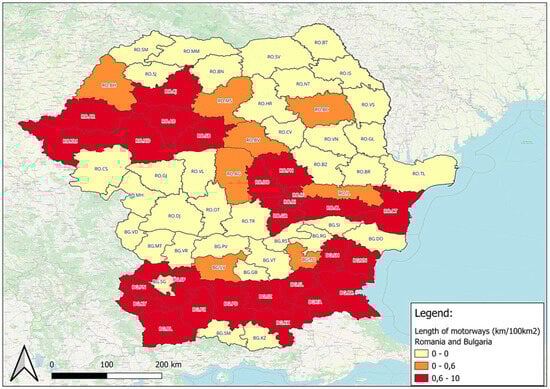 For the number of km related to the surface of the regions, it can be distinguished from Figure 9 that Bucharest has the highest value. In the case of Romania, there is a route from the east of the country (Constanța) to the west (Timiș). The regions with the highest values, with the exception of Bucharest-Ilfov, are found in the west of the country, connecting with western countries. Moreover, Călărași has a significant number of kilometers, being the county that connects with the access to Constanța (so to the Black Sea). Regarding Bulgaria, it can be observed that the regions in the north have fewer km of highway compared to those in the south.