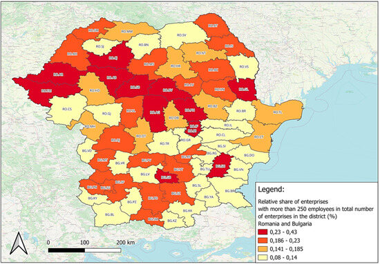 The regions with the highest percentages of large companies were Bucharest, Prahova, Sibiu, Alba, Arad, and Timiș, while values did not appear in Caraș-Severin, Giurgiu, or Bistrița-Năsăud. These low values can be explained by the presence of counties in the vicinity of regions with high values. In the case of Bulgaria, the regions with the highest percentage of enterprises with more than 250 employees were Gabrovo and Shumen, noting that the Bulgarian counties had lower percentages compared to Romania (Figure 10).