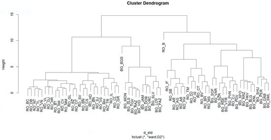 The most important agglomerative clustering methods are the complete/single/average link and Ward’s method, by which the degrees of similarity are presented based on the least/most/average similar objects, indicating the largest/smallest/average distance between them [25]. Ward’s linkage method combines those objects by which the overall variability within the cluster increases to the smallest possible degree. This method is used especially when a relatively equal number of objects in the classes is expected and if there are no outliers [26]. Although there are studies that support the elimination of outliers before implementing the cluster analysis because it leads to better quality [27], it must be taken into account that they also represent information that can help to understand data behavior [28]. In some situations, such as the analysis of the counties presented in the current study, they cannot be eliminated because it is necessary to understand the results of the countries as a whole, not the detachment of some regions as if they would not help to understand the economic processes in the respective countries.