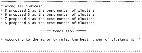 Figure 12 displays the numbers of indices that chose between two and five classes (these numbers appear because the researchers set a limitation of a minimum number of two classes and a maximum number of five classes). According to the results obtained, most indicators chose four clusters.