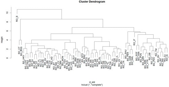 Figure 13 shows the dendrogram related to the clustering using the complete linkage method. Through this method, the difference between Bucharest and all other counties can be clearly noted, with it joining the other classes at a height of 10.78.