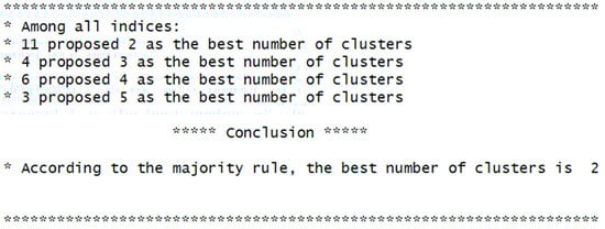 Figure 11 shows the dendrogram related to the classification of regions using Ward’s linkage method. After the Euclidean distances between the objects were calculated, based on the standardized data of the indicators presented in Table 5, the counties were joined so that the variability within the classes was minimal. Thus, it can be noted that the two large classes that can be visualized have joined at a height value of approximately 15. To determine the optimal number of classes, the NbClust package [32] was used, which contains a set of 30 indices, each index indicating a number of groups; at the end, a number of classes is recommended according to the maximum number of indices that indicated a certain number of clusters.