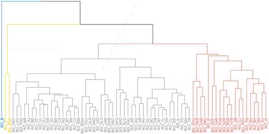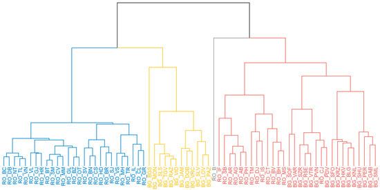 The division by classes, identified through various colors, made by the Ward method (Figure 15) indicates that Bucharest represents a cluster by itself, a fact that can be understood because it is the region with the best performance regarding RCI 2.0 in the two countries. However, in the case of this method, the Bucharest region appears to have characteristics similar to the red-colored regions, compared to the other two classes, a sign that the regions illustrated in red can have similar results to those of Bucharest, indicating that from the perspective of the analyzed indoctrinators, their performances can be considered better compared to the other regions belonging to the other two clusters.