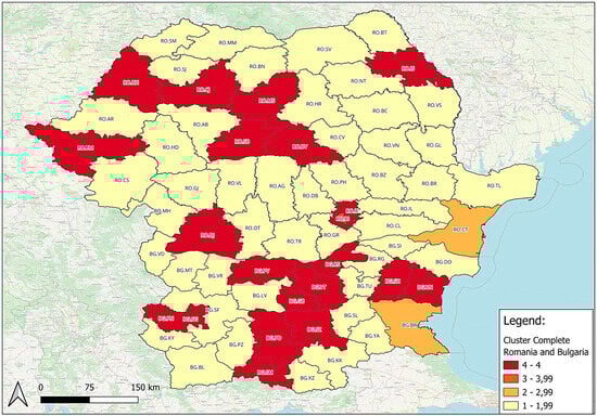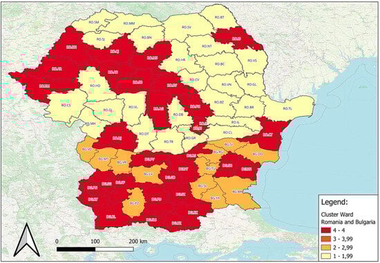 Figure 16 can help to geographically visualize the presentation of classes using Ward’s linkage method. In this case, Bucharest is illustrated in orange, having the highest values for the number of km of highway and the percentage of companies with over 250 employees. It also ranked among the lowest unemployment rates and infant mortality rates, among the most nights of accommodation, and a significant number of researchers and developers. Furthermore, it obtained the best value for physicians in health establishments per 10,000 inhabitants and an average value for the percentage of children enrolled in kindergarten. The class illustrated in yellow recorded low performances for the percentage of companies with over 250 employees and km of highway, for the second variable, the exception being Ialomita and Călărași. Moreover, these counties obtained low values for research and development staff and physicians in health establishments, as well as for the number of nights spent in accommodation units (except Suceava and Vâlcea). Additionally, average values for the unemployment rate and infant mortality rate and low to medium values for the group net enrollment rate of children in kindergartens were identified, for which there are high values for Harghita and Sălaj. The light orange grouping is characterized by low values for the number of km of highway, as well as for the relative share of enterprises with more than 250 employees in the total number of enterprises in the district, but also the tourism indicator. Medium to high values were identified for the unemployment rate, high percentages for children enrolled in kindergarten (except Sliven), as well as medium to high rates of infant mortality (less in Burgas, Pazardzhik, and Lovech). For the number of physicians in health establishments per 10,000 inhabitants and staff engaged in research and development, the recorded values ranged from low to medium. The class that included regions from both counties (red) presented a small to average number of highway kilometers, except Ilfov, which had the highest values. High percentages of enterprises with more than 250 employees were also observed. For the infant mortality rate and the number of nights of accommodation, the values were low to medium, with the exception of Brașov, Varna, Constanța, and Grad Sofiya, where the values recorded for the tourism indicator were among the highest. The number of physicians varied from medium to high values, the same being highlighted for the percentage of children enrolled in kindergarten (for this indicator, low values were observed for Constanța, Iasi, Sălaj, Timișoara, and Brașov).