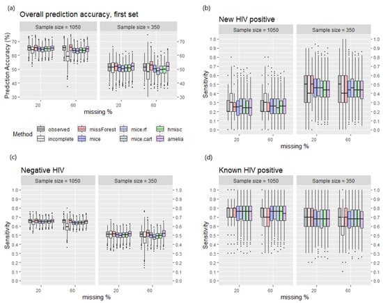 For HIV negative (Figure 3c), even though no new observations were included with imputation, sensitivity also improved. This suggests that when the new HIV+ class is more easily identified with the inclusion of more information in the other classes, via imputation, the difference between the classes becomes clearer for the model, improving then the classification of negatives too. Sensitivity for the HIV negative class presented smaller variability when compared to the other classes; this is explained by its large percentage in the test sample.