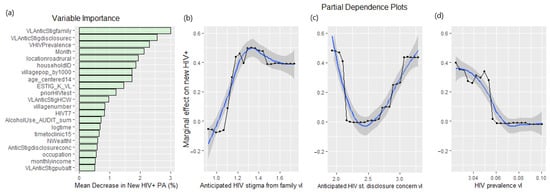 Importance plot for variables with decrease in PA of HIV+ larger than 0.5% in (a). Partial dependence plots for top three most important variables in (b–d). Observed values with respective trend curve are plotted in black, smoothed trend curve in blue, and 95% confidence interval for the smooth shaded in gray. vl stands for village level.