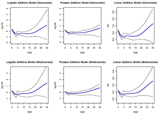Estimated nonlinear effects in the odds ratio, risk ratio, and risk difference of the PGR using the GAM.