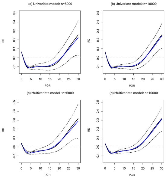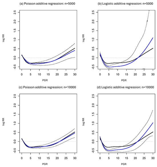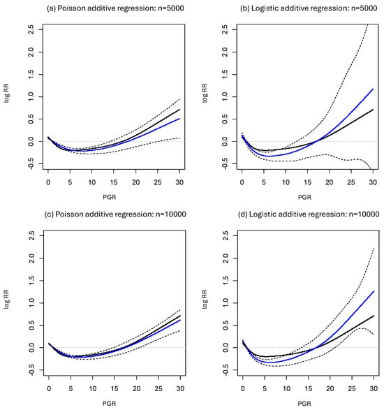 For an illustration, we applied the proposed methods to a breast cancer clinical study [,]. This study involved 2982 patients who had primary surgery for breast cancer in Rotterdam, and we considered a dichotomous outcome for recurrence or death within 5 years. The authors of the study reported that 1181 events (39.6%) were observed, and the odds ratio cannot be interpreted as an approximation of the risk ratio under such a condition. We considered fitting the logistic, Poisson, and Gaussian additive models to this dataset with modeling 0.01 × the progesterone receptor (PGR) level (fmol/mg) as a nonlinear term (univariate models). We also considered multivariate models that added the tumor size (≤20 mm, 21–50 mm, and >50 mm), number of nodes, and tumor grade (1 or 2, 3) as linear terms and 0.01 × the PGR level (fmol/mg) as a nonlinear term. We used the penalized cubic regression splines for modeling the nonlinear effect of the PGR level. We also calculated the 95% confidence intervals of the nonlinear functions that express the effect of the PGR level via 10,000 bootstraps.
