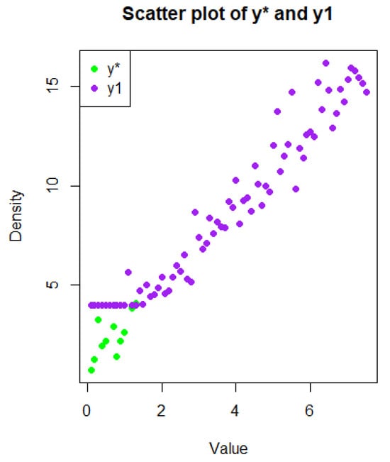 where , and . We accept only those simulated values such that , in accordance with the censoring rule. This process is repeated until the condition is satisfied. The accuracy of this approach is verified using a scatter plot.