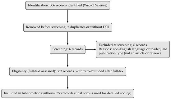 Then, eligibility was assessed in two stages. First, titles and abstracts were screened independently by two reviewers. Non-peer-reviewed documents (for example, theses, conference abstracts) and purely narrative reviews were excluded. The second stage involved full-text assessment of the remaining articles. No further exclusions occurred at this point. Following this process, as mentioned, 353 articles were retained for inclusion. Figure 1 summarizes the selection workflow using the PRISMA-2020 format [73]. Therefore, we identified 366 records across Web of Science, removed 7 records, and 6 records were excluded with incomplete metadata (missing DOI, title, or abstract). All 353 records retrieved at full text were eligible and entered into the bibliometric synthesis.