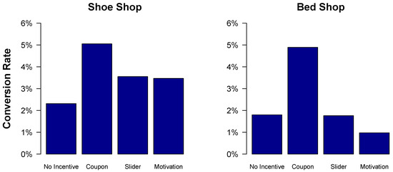Therefore, in the present paper, we are aiming to further close the above-mentioned research gap by examining the impact of different types of (in-store) purchasing incentives on each shop’s conversion rate. Additionally, we cast a further glance on the forecasting power of general clickstream data extending earlier in-store studies (cf. [17,18,19,20,21]). In more detail, we measure the conversion rate effects of advertising in the form of coupons, product sliders (i.e., “Other products that might interest you:”) or information about the shopping behaviour of peers (i.e., “Other customers bought these products:”). Additionally, we account for individual-specific exogenous effects captured by clickstream data like how the customer reached the online shop or how many pages he viewed.