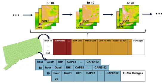 Under the time-indexed framework that was developed (Figure 2), geospatial features (e.g., soil type, topography, land use) inherent to some eventwise models are eliminated. The framework also requires no information about the power system. Instead, weather variables are described for each town. The model is left to learn implicitly the characteristics of each town within the service territory, essentially producing an outage model for each town. This feature representation forgoes the intensive selection and processing of geospatial data, yielding intuitive models in which terrain and infrastructure conditions are assumed to remain static in the long term.