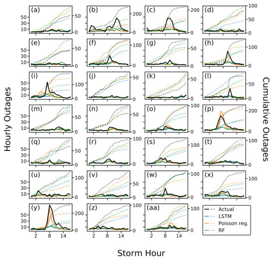 Figure 4 displays a comparison of actual and predicted outages for each hour during the 27 storms in the dataset. The KNN predictions were relatively uniform and are produced separately in Supplementary Figure S2 for readability. Based on outage patterns displayed in Figure 4, one may propose a naïve baseline model that predicts the center hour of the event window as the time to peak. However, in an operational setting the event trigger and the outage peak do not occur at a consistent point relative to the storm duration. Because of the unpredictability of the operational configuration of the event window, such an eventwise OPM would be incapable of providing neither naïve nor informed predictions about the expected time of peak outages for a given storm. For this reason, the skill apparently demonstrated by the Event-OPM with respect to predicting is prone to large uncertainty: the predicted of this model is the expectation of a uniform distribution of outages, i.e., the center hour of the event window.