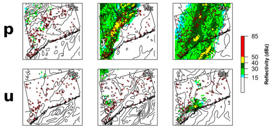 HRRR-simulated zero-hour reflectivity and contours of wind speed at three hours, overlaid with outage occurrences accumulated over the 18-h period of a well-predicted storm (“p”; average hourly ) on 17 July 2018 (top), and a poorly predicted storm (“u”; average hourly ) on 8 August 2018 (bottom). The center plot for each storm illustrates the hour of peak outages, with the left two hours before, and the right two hours later.