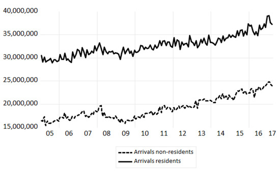 The database for the model estimations comprised the monthly arrivals and overnights statistics from Eurostat for the total of the EU-27 (unfortunately, no data were available for Ireland) from January 2005 until August 2017. In the estimations and forecasts, we separated between non-residents and residents (see also Figure 1 and Figure 2). For calculating the forecasting accuracy, we performed out-of-sample forecasting for three and six months ahead. For the computations, we used EViews 9.5, and EViews 10 for the final quarterly report.