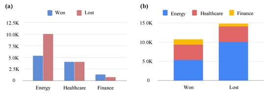 Data Exploration: (a) Distribution of sales opportunity records across the three business segments: Healthcare, Energy, and Finance. (b) Closed sales opportunities final status.