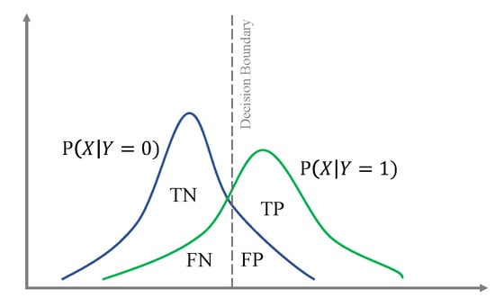 However, the decision boundary can be calibrated arbitrarily to reflect more on the distribution of the data. The influence of the decision boundary on the number of true positives , false positives , true negatives , and false negatives in binary classification is illustrated in Figure 2 (see Table 3 for definitions). In this work, we find the optimal decision boundary for a classification model by maximizing all true conditions (both and ) which in return, minimizes all the false conditions ( and ). Visually, this decision boundary is a vertical line passing through the intersections of and in Figure 2.