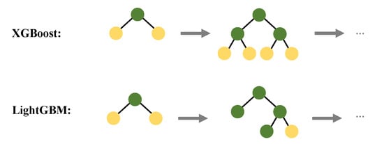 In an endeavor to reduce the computation time of the XGBoost algorithm, Ke, et al. proposed LightGBM [23]. The main difference between XGBoost and LightGBM is how they grow the decision tree (see Figure 3 for a high-level comparison). In XGBoost decision trees are grown horizontally (level-wise) while with LightGBM decision trees are grown vertically (leaf-wise). Importantly, this makes LightGBM an effective algorithm to handle datasets with high dimensionality.
