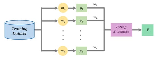 Voting Ensemble combines predictions of multiple classifiers using weighted average to compute a final prediction P.