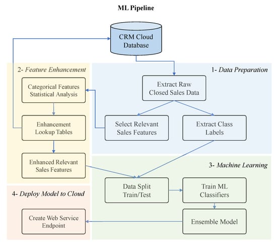 The main objective of the ML pipeline is to train predictive models on the closed sales opportunities data. As illustrated in Figure 5, there are four main steps in this pipeline: