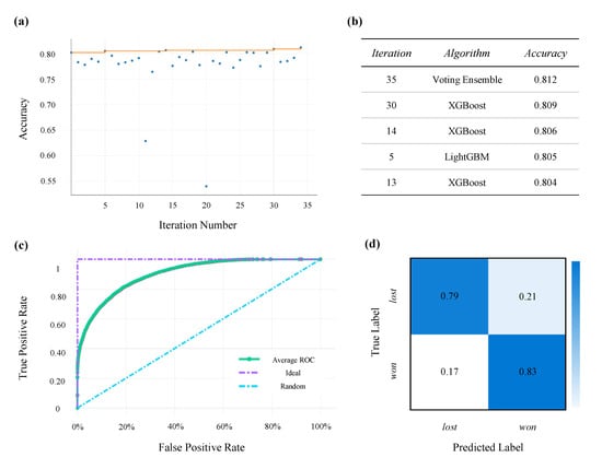 ML Training Results: (a) Training accuracy for all model iteration. (b) Accuracy of the top five iterated models sorted by the training accuracy. (c) ROC curve of the voting ensemble classifier. (d) Confusion matrix showing the four scenarios of classification for the voting ensemble model.