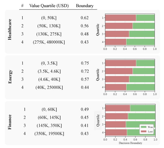 As explained in Section 2.4.2, statistical analysis of historical sales data is performed in each business segment (Healthcare, Energy, and Finance) to determine the decision boundaries. Specifically, the decision boundary was optimized for each of the four sales value quartiles of each business segment. The decision boundaries, demonstrated in Figure 8, ranged from (Finance business segment—3rd value quartile) to (Energy business segment—1st value quartile).