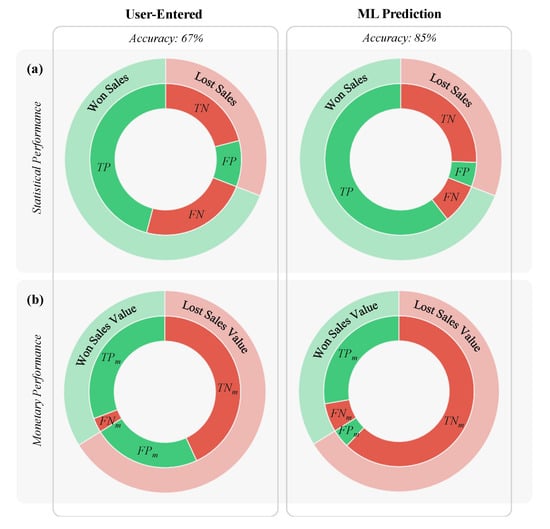 The performance of the user-entered and ML predictions was also compared with reference to the monetary metrics (see Section 2.3.1 for more details). As shown in Figure 9b, sales opportunities falsely predicted to be won by the ML workflow had considerably lower cumulative monetary value (compare the true positive slice proportions). This implies a lower monetary loss due to prediction error when using the ML predictions. Quantitatively, the monetary accuracy of the ML model was notably higher than the user-entered ( versus ). Other monetary performance metrics are listed in Table 5.