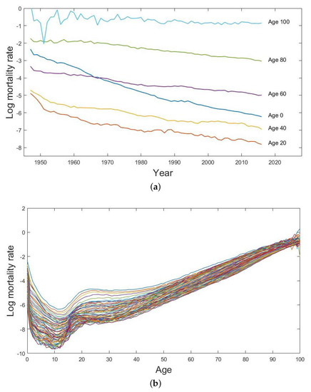 (a) Univariate time series of the log age-specific male mortality rates with 20-year age intervals and (b) the log male mortality curves from age 0 to age 100 from the year 1947 to the year 2016 in Japan.