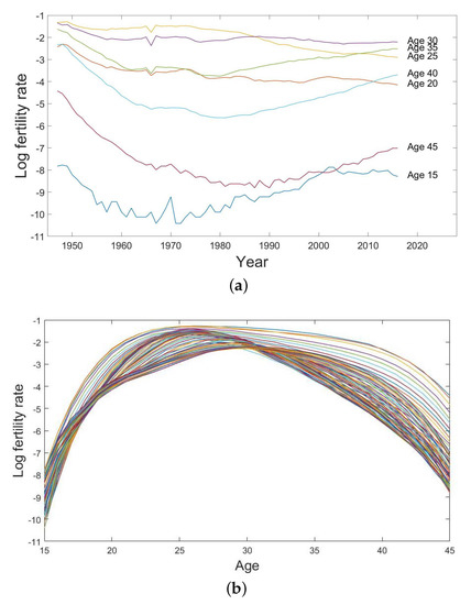 (a) Univariate time series of the log fertility rates with 5-year age intervals and (b) the log fertility curves from age 15 to age 45 from the year 1947 to the year 2016 in Japan.