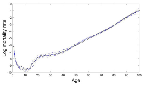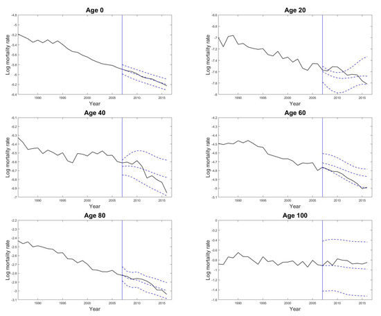 In the demonstration of the proposed model, we aim to display 10-years-ahead out-of-sample forecasts of mortality rates. We first split the dataset into a training dataset with the observed mortality rates from the year 1947 to the year 2006 and a test dataset with the remaining observed mortality data from the year 2007 to the last sample data in the year 2016. We use our GPR model in Equation (3) to fit the male mortality rates for each given age in the training dataset. We equally place the interior knots inside the quantile position of the training time interval in the natural cubic spline mean function in Equation (4), and use two Gaussian mixture components in the spectral mixture covariance function in Equation (7). These settings are the minimal requirements for the number of parameters needed for the Gaussian process mean function and covariance function. Further tests on the numbers of knots K and Gaussian mixture components Q have been made, and no significant difference in our experiment results was found when and . The parameters including the parameters of the mean function and the hyperparameters of the covariance function and the noise variance can be estimated by maximising the log likelihood function in Equation (8) for each given age x. However, estimating all unknown parameters involved both in the mean and the covariance structures for all age groups can be time demanding with high computational costs in practice. Following the suggestions of Shi et al. [37], we remedy this problem by computing the parameters of the mean function through the ordinary least squares approach and then estimating the parameters of the covariance function by maximising the log likelihood function in Equation (8). This estimating procedure is analogous to de-trending the age-specific mortality rates by the empirical mean function then modelling the residuals by a zero-mean Gaussian process. It indeed improved the stability and the speed of the estimation procedure for all (hyper-) parameters in our numerical examples.