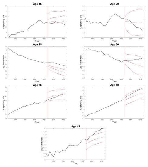 - Lee, R.D. Modeling and forecasting the time series of US fertility: Age distribution, range, and ultimate level. Int. J. Forecast. 1993, 9, 187–202. [Google Scholar] [CrossRef]
