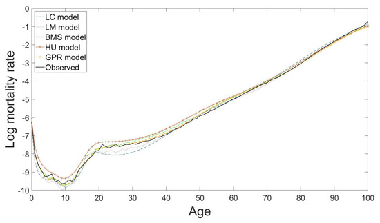 Figure 7 presents an example of the 10-years-ahead out-of-sample forecast results of the Japanese male mortality curves from age 0 to age 100 for the year 2016 using the LC model (with RMSE = 0.2172), the LM model (with RMSE = 0.1660), the BMS model (with RMSE = 0.1109), the HU model (with RMSE = 0.2342) and the GPR model (with RMSE = 0.0895) based on the observations from the year 1947 to the year 2006. The root mean square error (RMSE) measures the standard deviation of the average squared prediction error regardless of the positive or negative sign, and is defined here as