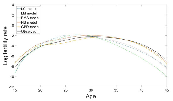 The LM model, the BMS model and the HU model can be thought of as the extensions and variants using the similar framework of the LC model in Equation (11). Their ways to make forecasts of the mortality (or fertility) curves also depend on the extrapolation of the time parameters derived from the age-time matrix of the log mortality (or fertility) rates [39]. More specifically, the LM model is a modification to the LC model where the coefficient series is adjusted so that the fitted life expectancy is equal to the observed life expectancy in each year in an attempt to reduce forecast basis. The BMS model modifies the LC model to adjust the coefficients using the age-at-death distribution and determines the optimal fitting period beforehand to address the non-linearity problem in the time component. The HU model extends the LC model by adapting the functional data paradigm using non-parametric smoothing to reduce outliers in observed data and more principal components for robust forecasts.