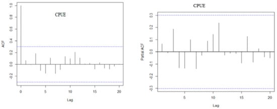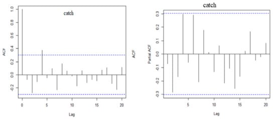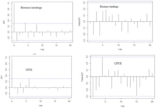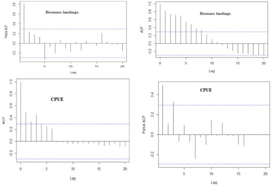 Figure 3. Autocorrelation and partial autocorrelation functions of original fishery landings and CPUE.