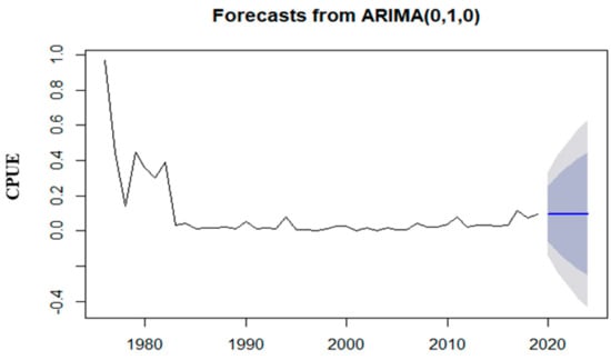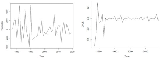 However, the ARMA model works with stationary data which is not the case with fish landings and CPUE data [24]. Therefore, the application of differencing to remove a mean trend from non-stationary series is the common procedure for transforming non-stationary data to stationary [25]. The procedure has been advocated in the Box–Jenkins approach [26]. In this paper, the autoregressive integrated moving average model (ARIMA (p,d,q)) is introduced to deal with non-stationary data. The general form of the ARIMA model is