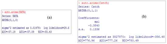 17. Stergiou, K.I. Modelling and forecasting the fishery for pilchard (Sardina pilchardus) in Greek waters using ARIMA time-series models. ICES J. Mar. Sci. 1989, 46, 16–23. [Google Scholar] [CrossRef]
