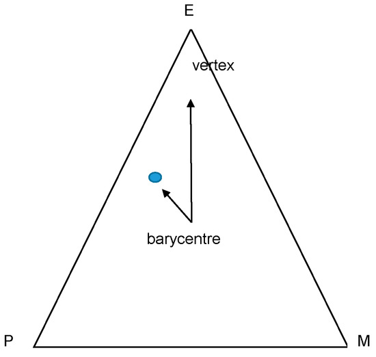 This metric of disagreement for BCS can be derived as follows. Assuming that the number of answering categories is three—rise (P), fall (M), and no change (E)—and given that that the sum of the shares of responses adds to a one, a potential representation of the vector of aggregated shares of responses is as a point on a simplex that encompasses all possible combinations of responses (Figure 2). In the equilateral triangle, the vector of responses, denoted as blue point, corresponds to the unique convex combination of three reply options for each period in time.