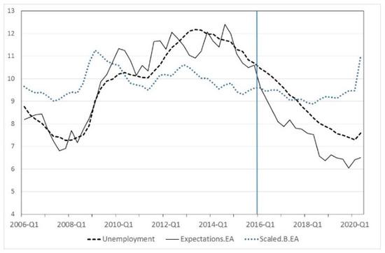 Figure 3 also includes the evolution of the scaled balance of question X7 (Scaled.B.EA), which is the survey question regarding consumers’ unemployment expectations. The balance is scaled by regressing unemployment rates on X7 during the in-sample subperiod. This procedure was proposed by [29], and can be regarded as a specific case of the regression method for quantifying aggregate survey responses.