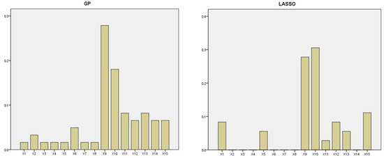 Bar chart with relative frequency of variable selection—genetic programming (GP) vs. the least absolute shrinkage and selection operator (LASSO).