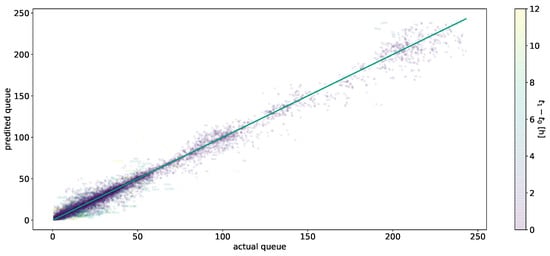 The neural network-based approaches performed overall the best out of all tested approaches. The SLP model without any hidden layers surprisingly beat all MLP models (see Table A1), which tended to overfit during training. Figure 3 shows the predicted values versus the actual values, with values on the green line being optimal. The residuals can be obtained by looking at the distance between the data points and the diagonal. For queue lengths smaller than 60, most of the predictions were very close to the diagonal, meaning a very low prediction error. Higher queue values occurred far less frequently, and we saw for these values an increased prediction error on average. Regarding the heuristic model, predictions with a greater time horizon, which are colored in green or yellow, tended to yield worse results. In general, we did not see any systematic errors in the predictions, which indicated together with the MAE of a small amount of uncertainty for the SLP model.